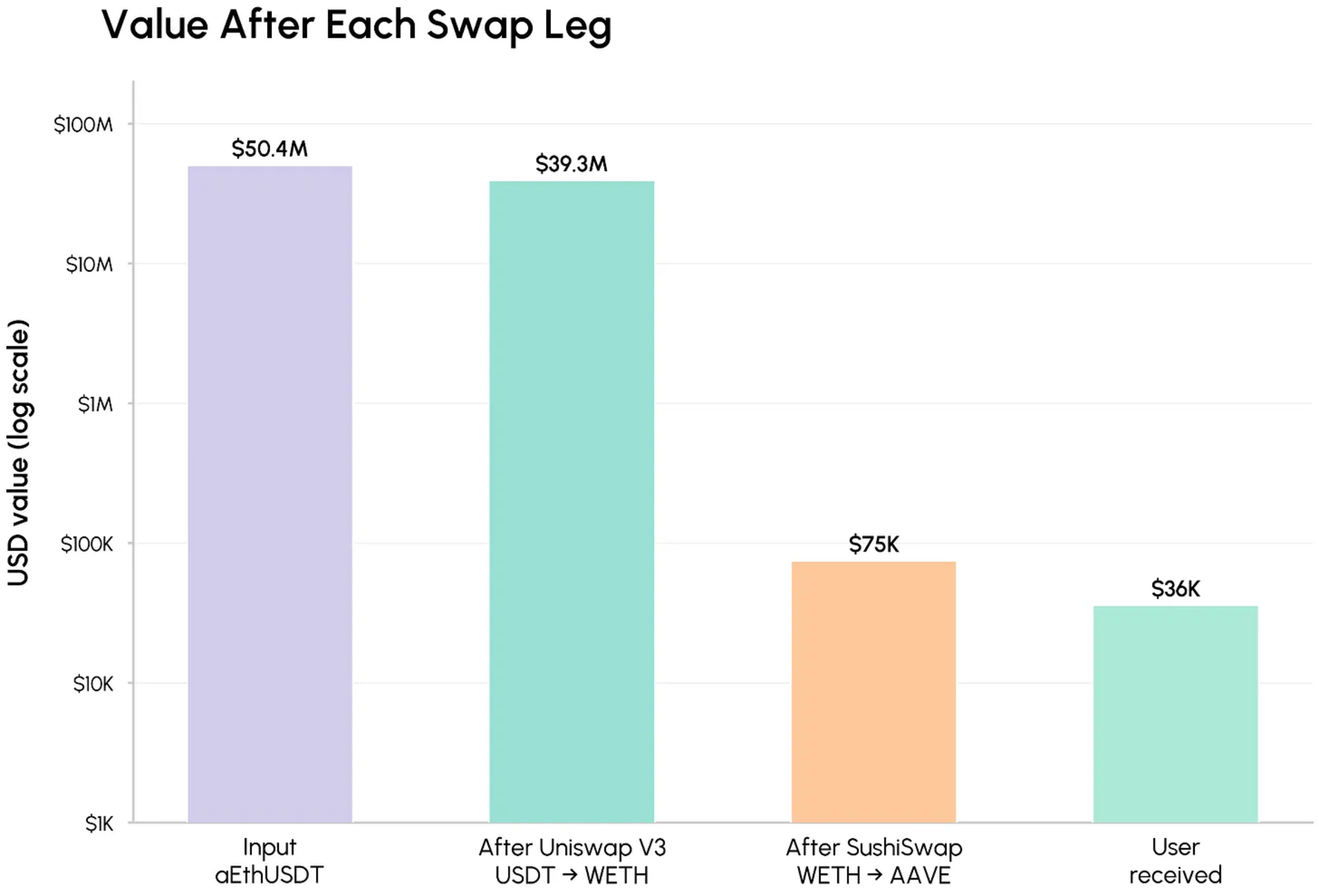 在这种情况下,胜出的求解器将赎回的 USDT 在 Uniswap V3 上兑换成封装 ETH(WETH),然后将该 WETH 路由至一个流动性较低的 SushiSwap AAVE/WETH资金池,大部分价值就在这里损失了。可以追踪这笔交易在区块24,643,151中每个环节的资金流向,并查看价值是在哪里损失的。