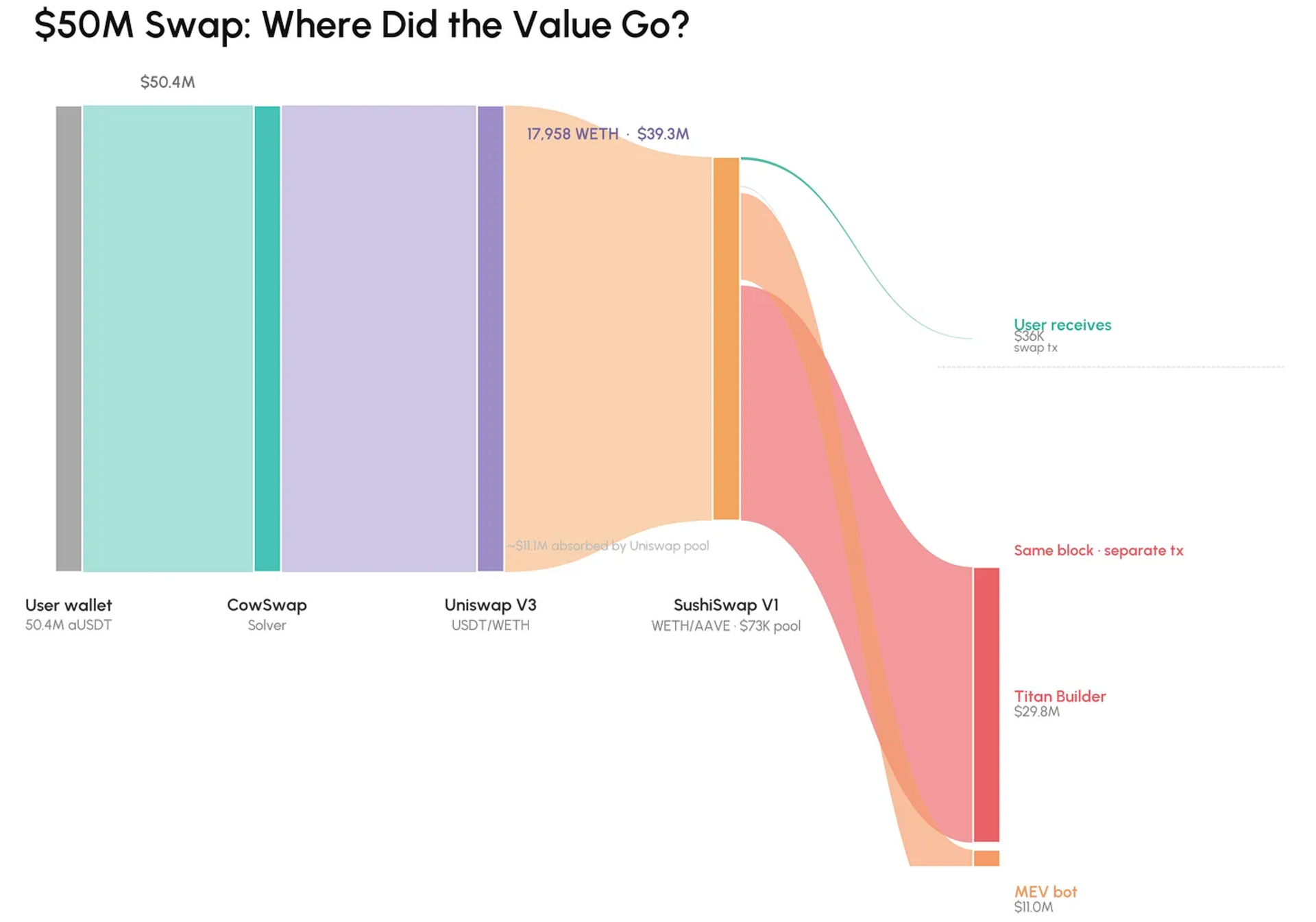 价值并没有消失,而是被重新分配给了该区块内的其他参与者。如上图所示,总额中约 2700 万美元最终作为区块排序支付给了 Titan Builder,约 1000 万美元被夹击该交易的三明治攻击 MEV 机器人捕获,而用户的新 AAVE 头寸中仅剩下约 3.6 万美元。