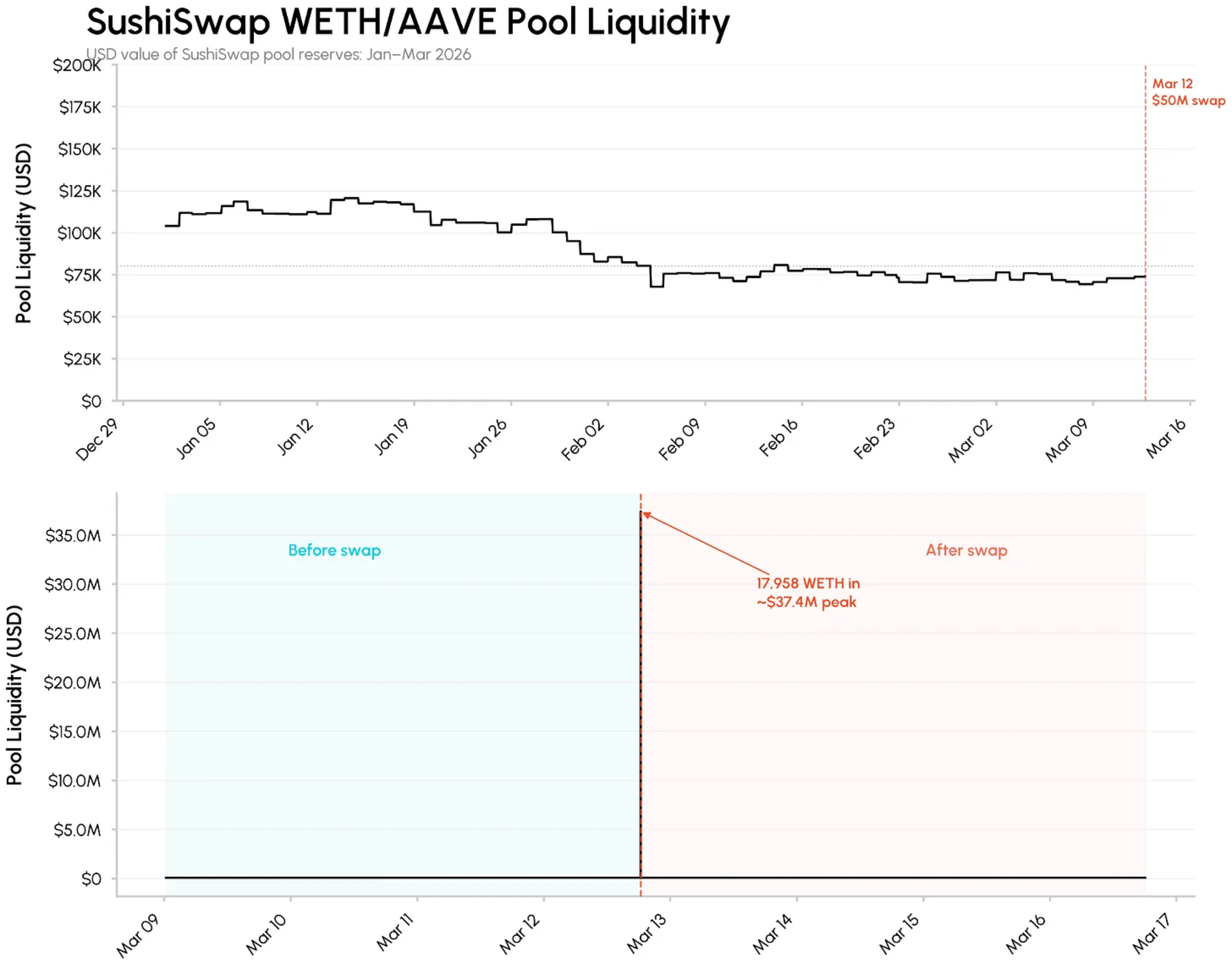 3 月 12 日,一位用户执行了一笔价值 5000 万美元的兑换,结果损失了其初始价值的 99.9%。该钱包通过以太坊主网上的 Aave 界面兑换了 5040 万美元的 USDT,最终仅收到价值 3.6 万美元的 AAVE。这使得该事件成为链上执行风险最戏剧性的例子之一,一笔大额交易在无需许可的系统中遭遇了浅薄的流动性。