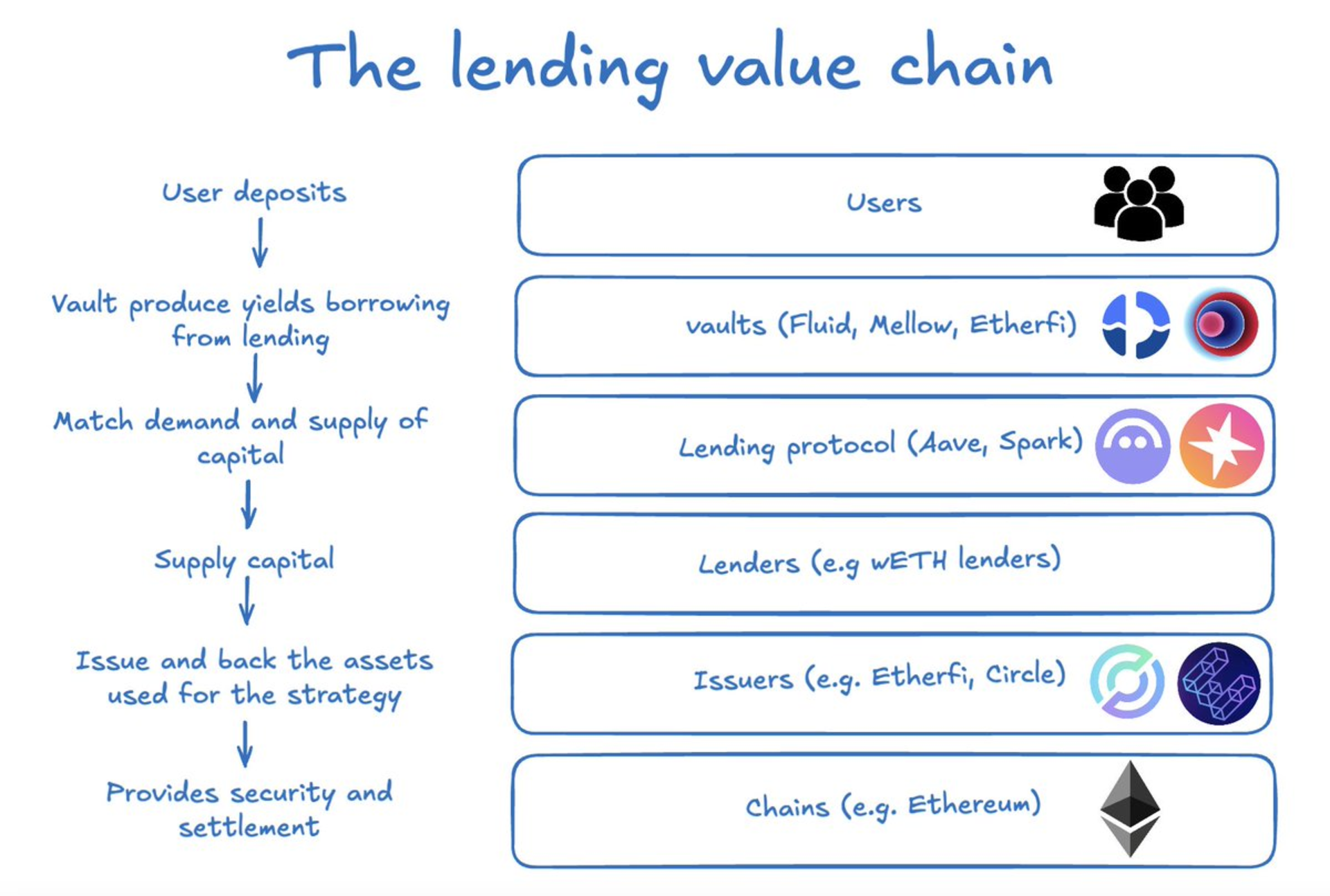 换言之,Aave 赚的钱不仅超过基于其之上的 Vault,也超过那些提供可用于借贷的链上资产的发行方(如 Lido、EtherFi)。为了理解原因,我们从链上信用价值链的角度拆解这些跨池化流动性的费率流向。