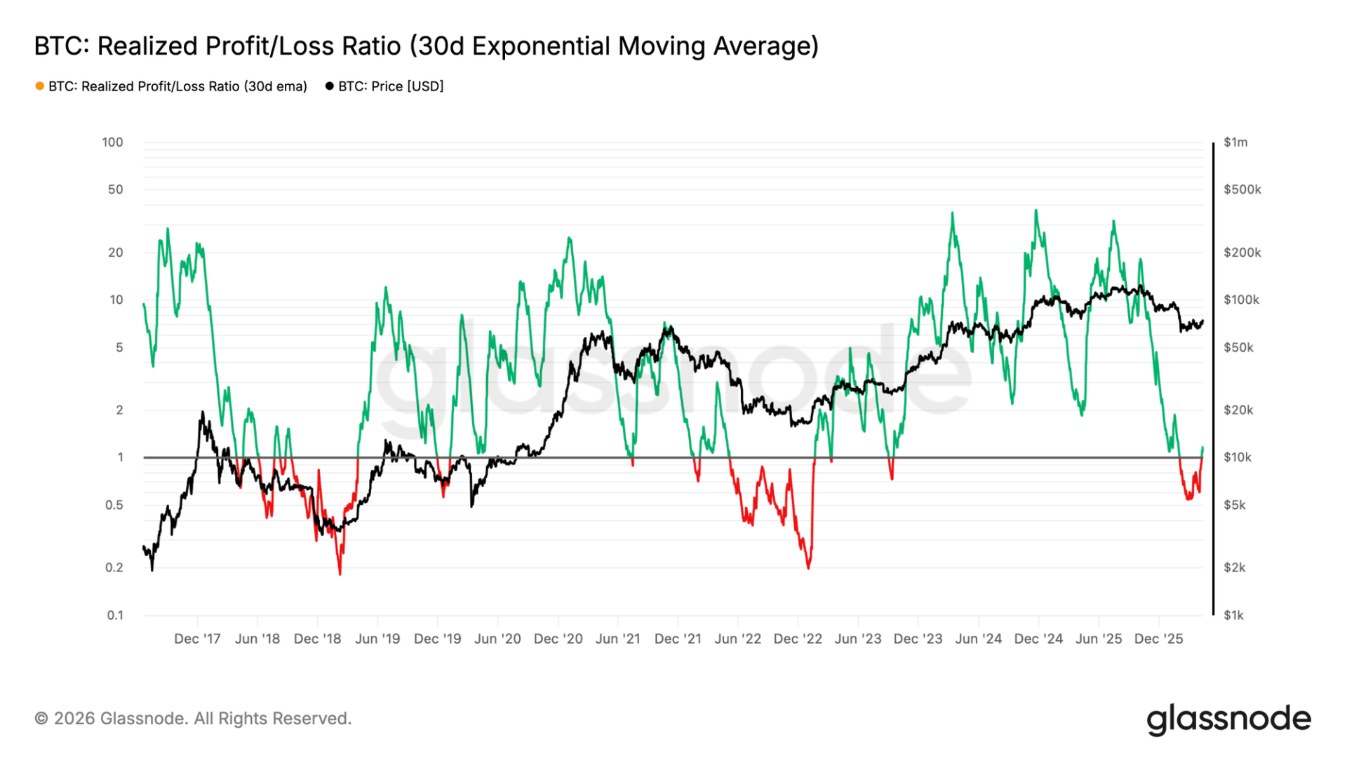 基于上述短期衰竭信号,对市场动能的长期评估需要审视投资者基础的已实现盈亏平衡。已实现利润/亏损比率衡量链上每实现一美元亏损对应的已实现利润美元价值,30 日 EMA 平滑短期噪音以揭示潜在趋势。