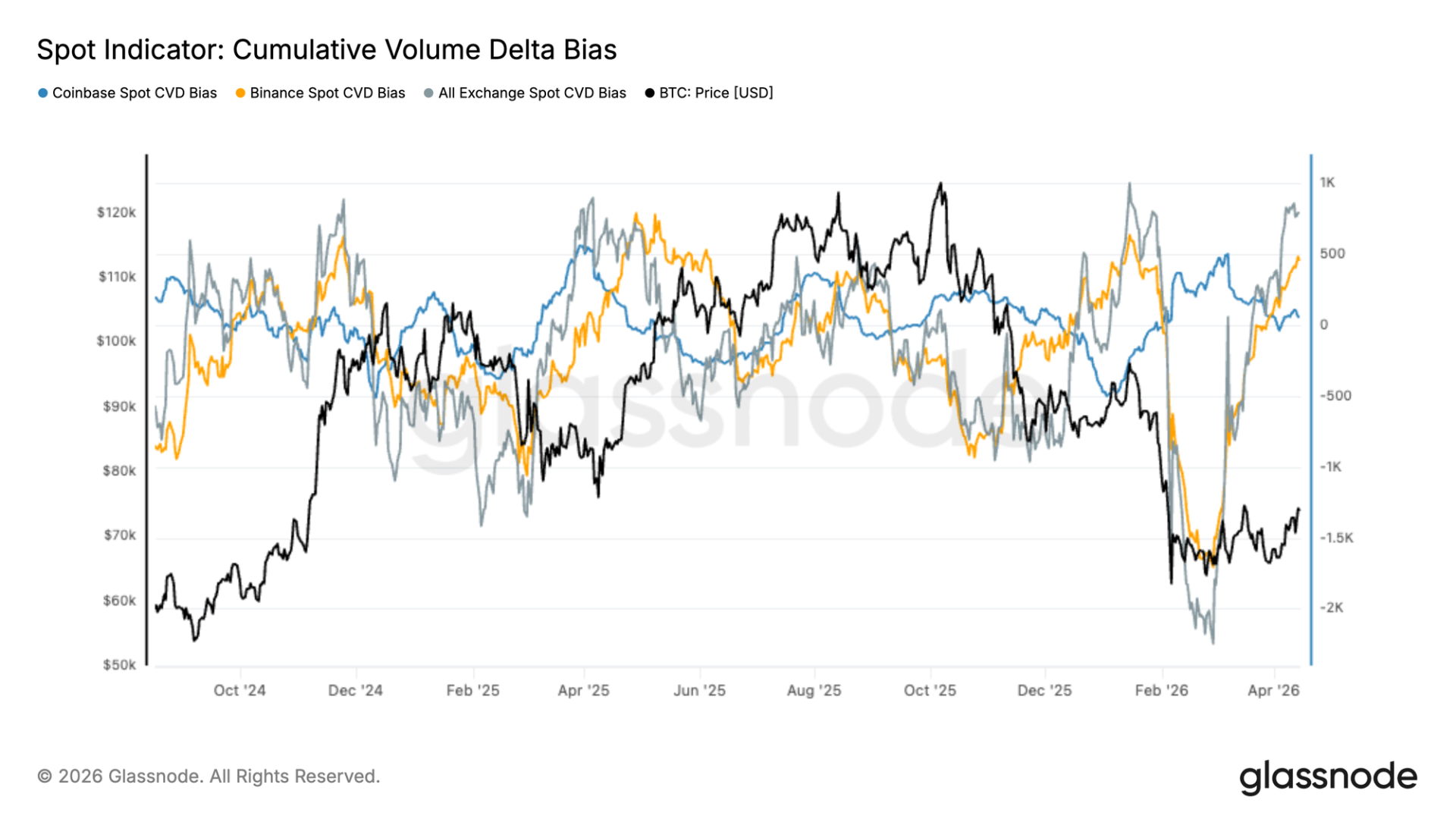 继二月份的清算事件之后,现货 CVD 已大幅反弹,总流量从深度负值区域恢复到正值区域。这一转变表明从激进的卖方压力向净现货积累的明确过渡,与近期的价格稳定一致。然而,各平台的需求复苏并不均衡。