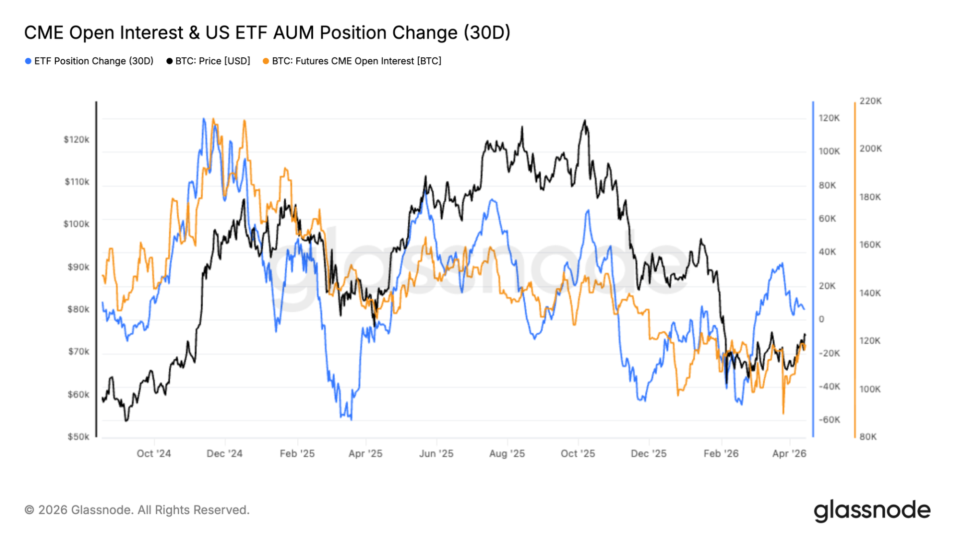继二月份的下跌之后,机构风险敞口趋于稳定,CME 未平仓合约和 US ETF 管理资产流量均显示出早期复苏迹象。经过一次急剧的去杠杆后,CME 持仓已开始从局部低点重建,表明基于期货的风险敞口逐步回归。