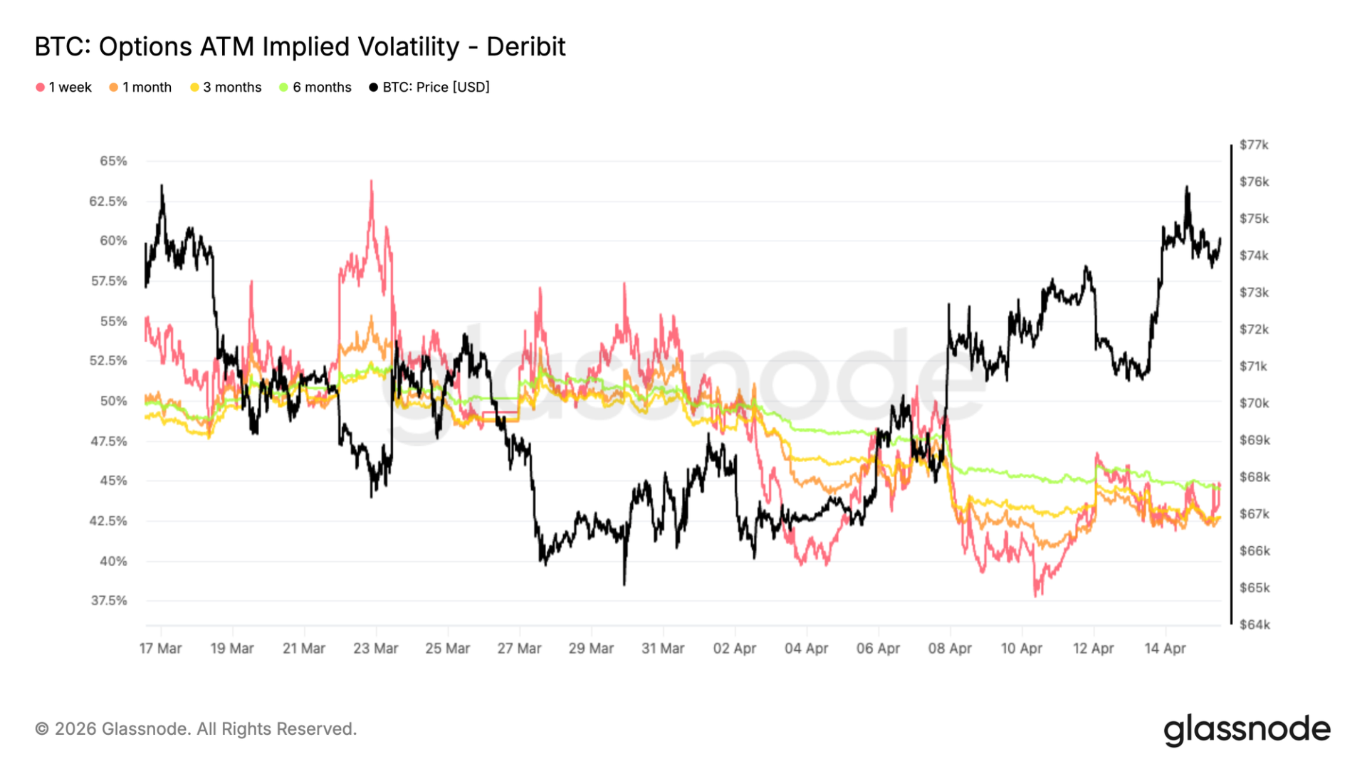 现货的反弹行情并未转化为波动率的有意义重定价,隐含波动率在整个曲线上下降。近月合约走软,而长期期限也重新定价走低,指向波动率预期的整体正常化。期限结构保持相对平坦,1 个月波动率交易在约 42.6%,略低于 3 个月,反映出对定价近期风险的紧迫性有限。这种压缩表明近期地缘政治头条不再被视为持续动荡的催化剂。相反,即使宏观不确定性仍未解决,波动率正被重新定价向更稳定的条件。各期限的平行下移表明交易者正在解除保护而非增加新风险敞口。
