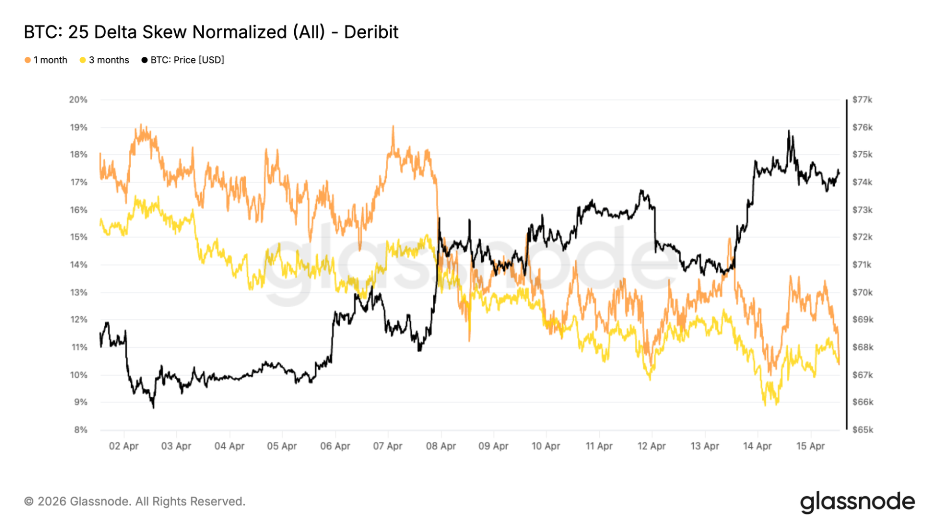 虽然波动率水平已缓解,期权的相对定价仍显示出对保护的偏好。25 delta 偏度在各期限上仍偏向看跌期权,表明看跌期权相对于看涨期权仍存在溢价,尽管偏度本身已有所下降。