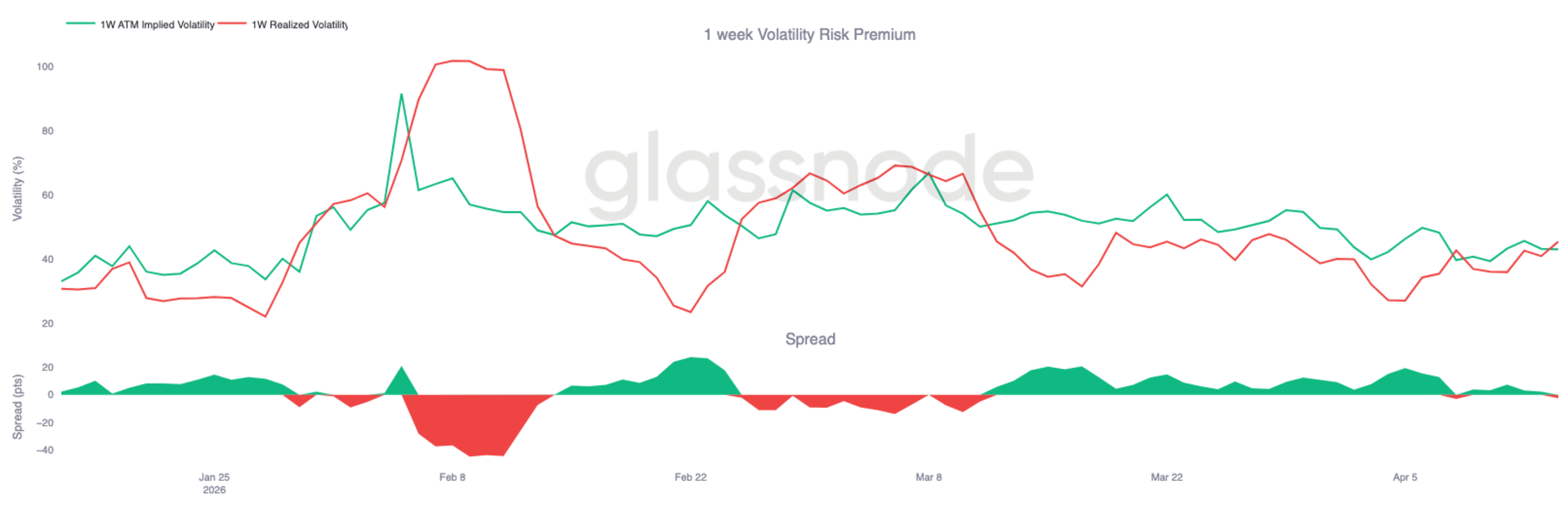 进一步观察波动率曲面,短期波动率风险溢价已翻转,实现波动率现在超过隐含波动率。该价差衡量前瞻预期与实际价格变动之间的差距,目前接近 -2 个波动率点,平值隐含约 43,实现约 45。