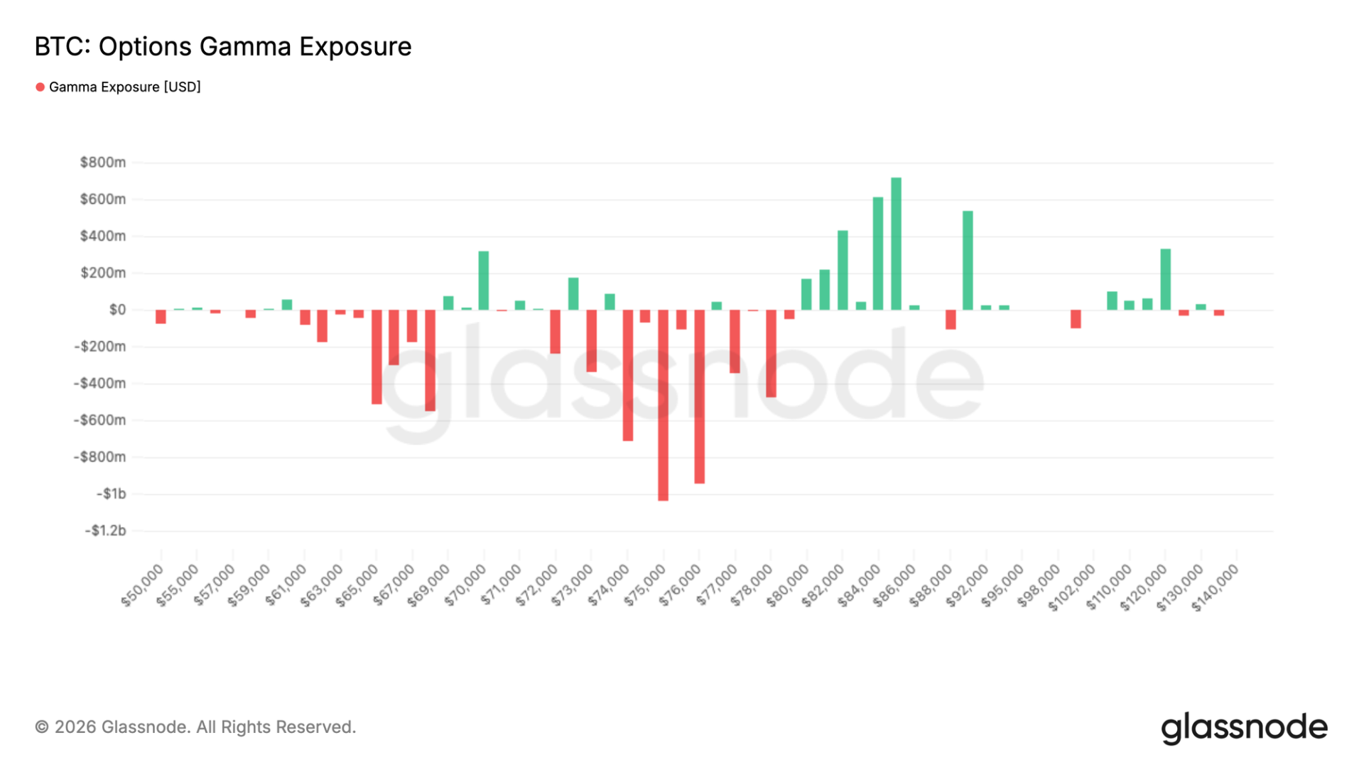 从市场结构角度看,做市商持仓在近期价格行为中扮演核心角色。大量负 gamma 集中在 $74K 至 $76K 区间,约 30 亿美元的风险敞口位于现货之上,形成了一个对冲流动可以影响方向的区域。