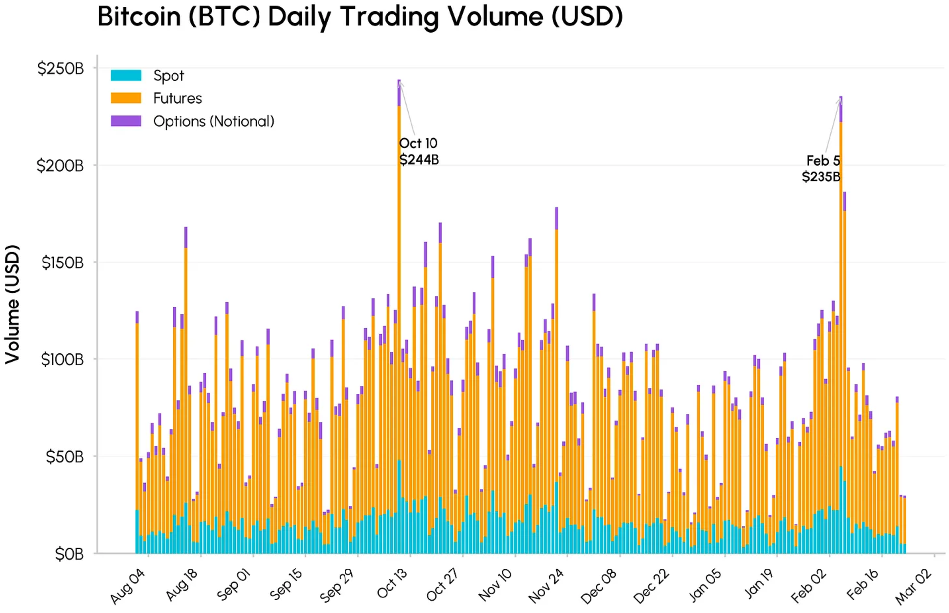 现货、期货和期权的交易量在 10 月 10 日和 2 月 5 日均急剧飙升。BTC 总交易量分别达到 2440 亿美元和 2350 亿美元,其中 2 月 5 日期货交易量以 1770 亿美元占据主导。尽管发生了程度相当的严重市场失衡,但现货交易量略低于 10 月份,这与订单簿变薄加剧了市场波动的观点一致。从历史上看,这种高成交量的抛售往往与强制抛售的衰竭同时发生,表明下跌最猛烈的阶段可能正接近尾声。