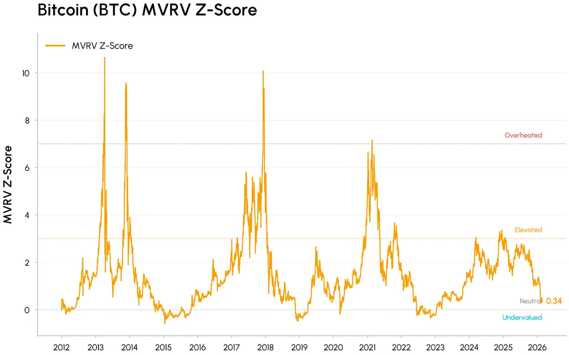 与此同时,像 MVRV(比较比特币市场价值与持有者总链上成本基础的比率)这样的估值指标,已压缩至其历史低估区间,但尚未达到与先前熊市底部相关的极端水平。这些指标表明,市场已经消化了早期的大部分泡沫,正逐渐漂向一个价值区域。