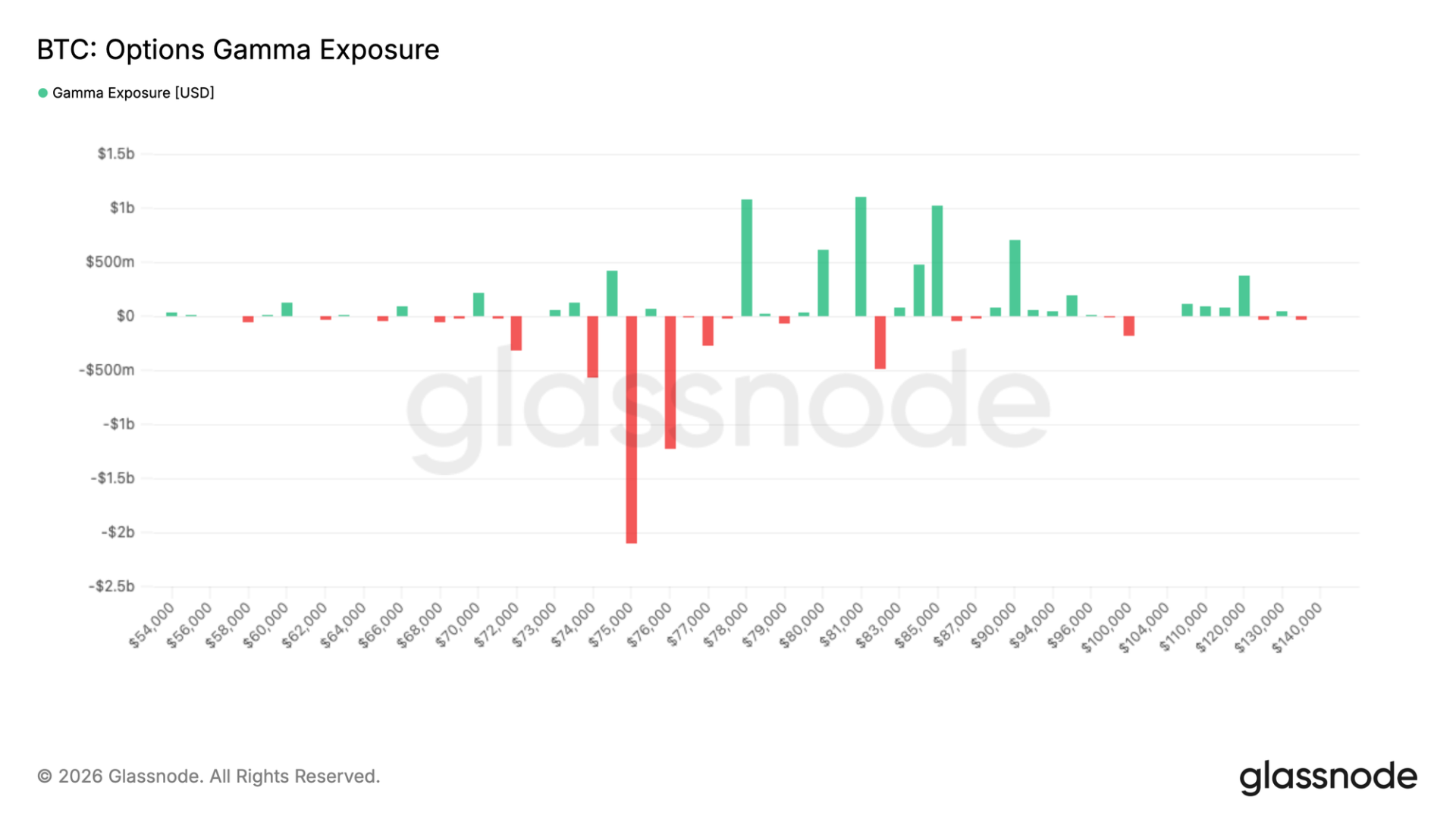 观交易商 Gamma,头寸格局愈明。大量负 Gamma 集中于现价下方,尤 75K 区域敞口至最极端水平。